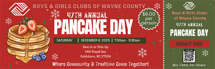 Join us for the 47th Annual Pancake Day Fundraiser on Saturday, December 6, at the Boys & Girls Clubs of Wayne County in Goldsboro. This long-standing community tradition brings families and friends together for a warm breakfast, photos with Santa, holiday activities for kids, and festive fun before the Wayne County Christmas Parade.